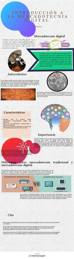 piktochart es una herramienta en línea que permite crear infografías gratuitamente. Esta ofrece plantillas predefinidas en las cuales es posible agregar y dar formato al texto (tamaño, tipo, tipo color, alineación, etc.), agregar contenidos multimedia como imágenes y videos, entre otras posibilidades, para que el creador de la infografía pueda ordenar la presentación de su tema.